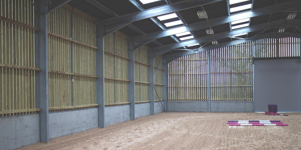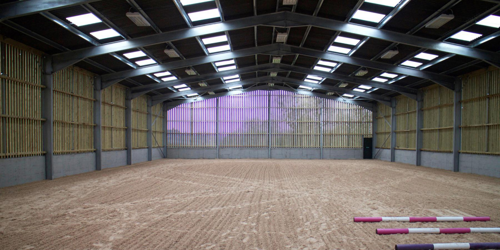 Providing a safe, weather-proof environment for his daughters to exercise their horses in, was Peter Bull’s main aim when he constructed a new equestrian building at his specialist joiners and builders premises in Marston Montgomery, Derbyshire. Secondary to that was his desire to construct a building that sat well with the others at the site and blended in sympathetically with the rural surroundings.Peter’s attention to detail and knowledge of the building materials available has led to a building that is not only a pleasure to ride in, but one that also complements its surroundings beautifully.“One of my daughters was involved in an accident on the road near here, and it was a real game changer for me,” says Peter. “I knew I wanted to provide them with a safe and secure place to exercise their horses, whatever the time of day or weather.”The 20 x 40m indoor riding arena has a height of 4.5m to enable plenty of clearance when horse and rider are jumping, and is seven purlins long. The site itself sloped by about 1.5m from front to back so had to be built up and levelled before construction began.Peter used Eternit profile 6 fibre cement roof sheets in Laurel Green and natural Yorkshire boarding, to help the building blend in with the surrounding agricultural land. As well as providing excellent noise and thermal insulation, the composition of the high strength fibre cement reduces condensation within the building, which is important when multiple horses and riders are exercising inside.Being able to select from a wide range of roofing sheet colours was particularly important to Peter, as he wanted to choose a colour that would fit in with the building’s rural location.“Come the spring we’ll landscape the area around the arena, but I’m really happy with the way the building looks and how it fits in,” he says.“By roofing the arena we’ve provided a safe, comfortable place for my daughters to train in day or night, and we can lock the door and leave horse equipment in there without fear of it being stolen. The building is performing well and the atmosphere is clear and refreshing, even when it’s full of sweating horses. It’s a pleasant place to be.”